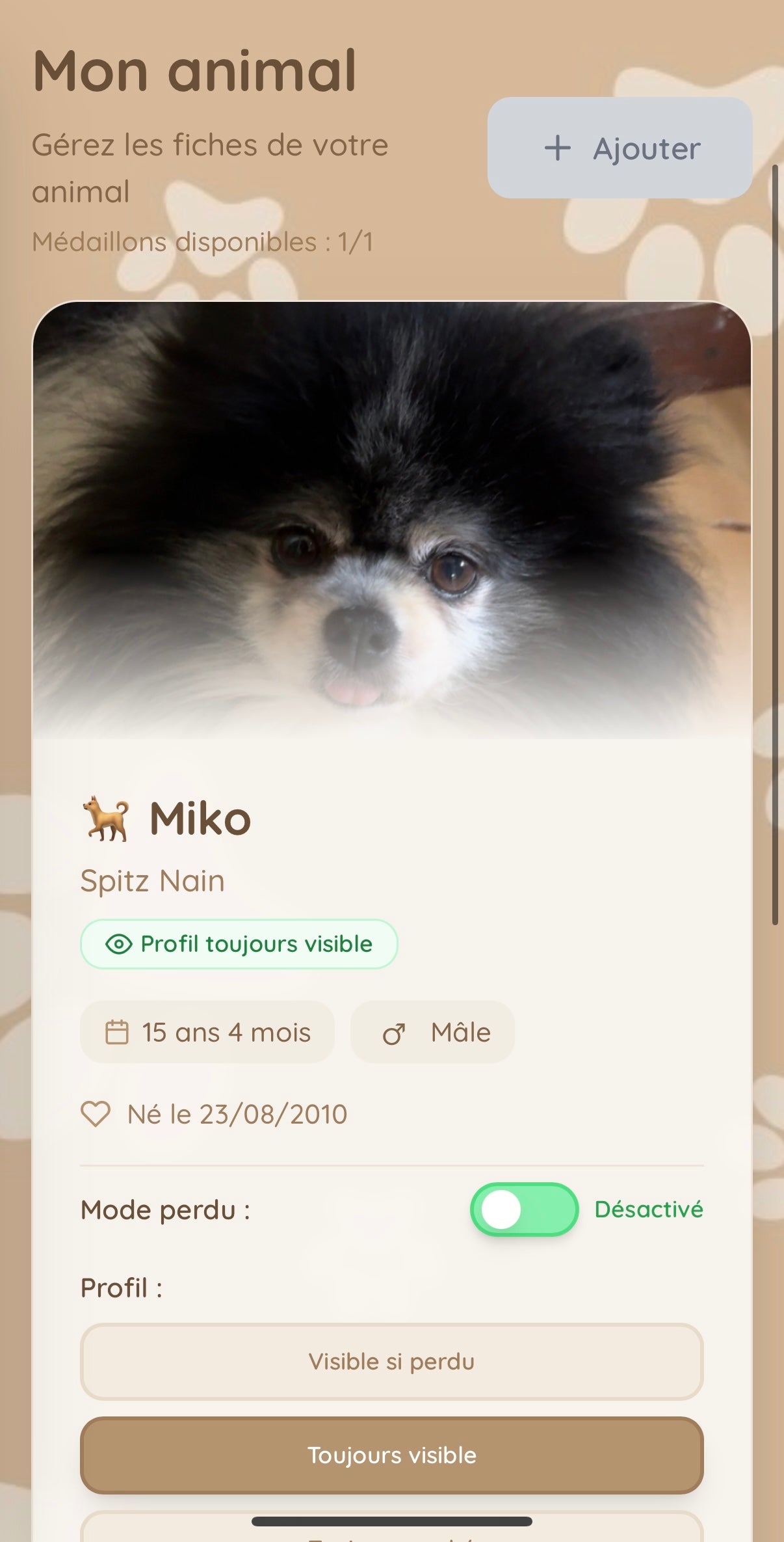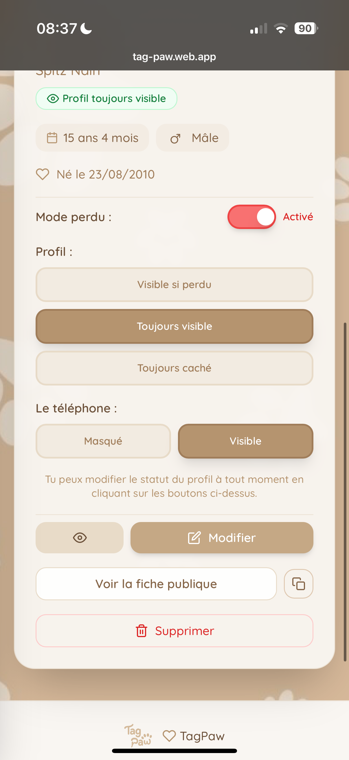 Ta fiche devient alors visible pour toute personne qui scanne la médaille. Elle pourra voir sur ton compagnon est perdu et pourra :